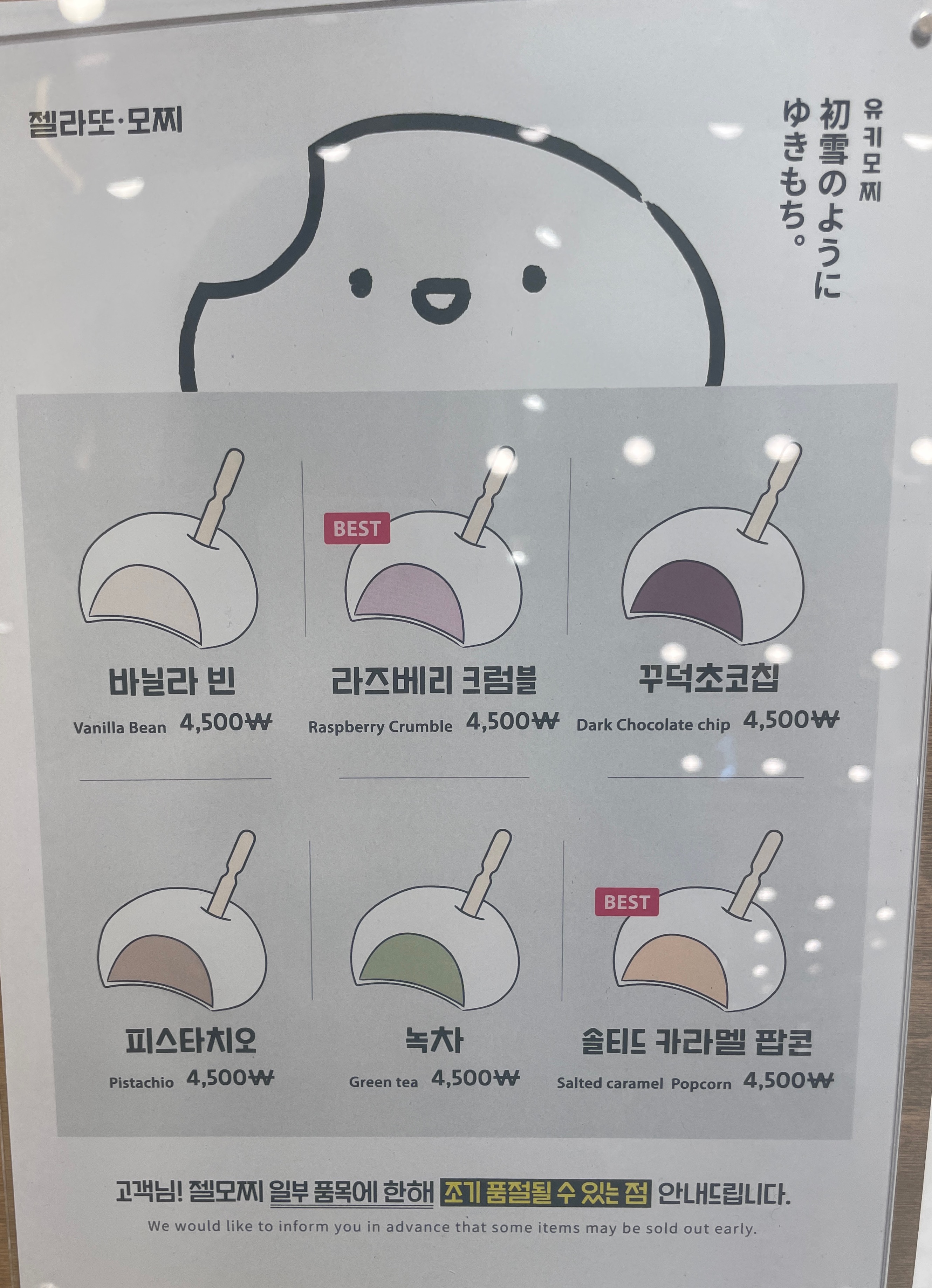 연남점에서는 줄서 먹는다고 하던데! 지점이 많이생겨 쉽게 먹을수 있어 좋다. 유키모찌 연남점에는 맛도 더 다양한것 같은데 베스트 메뉴만 들어온건가?!