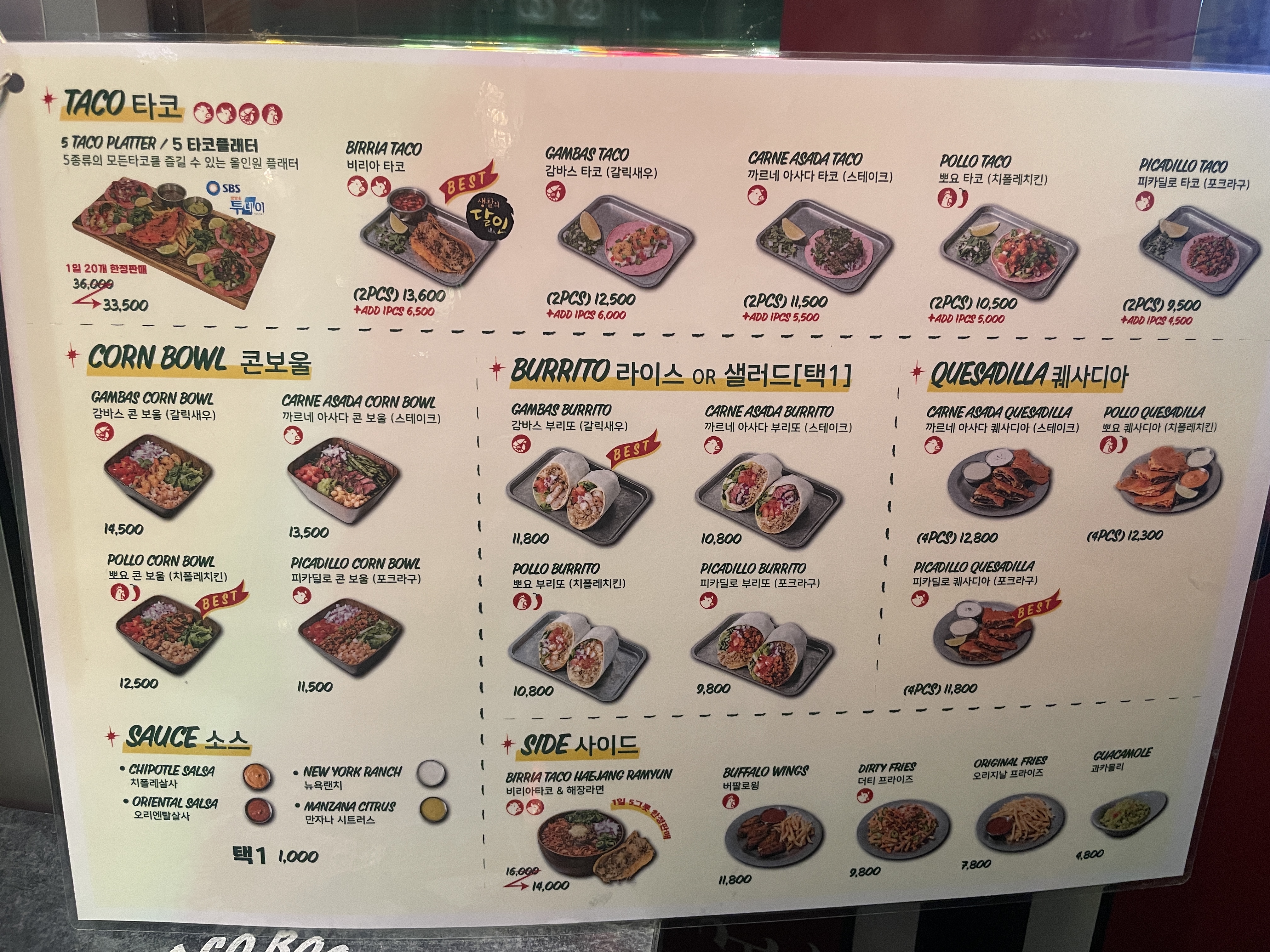 메뉴는 타코 부리또 퀘사디아 보울이 있었고